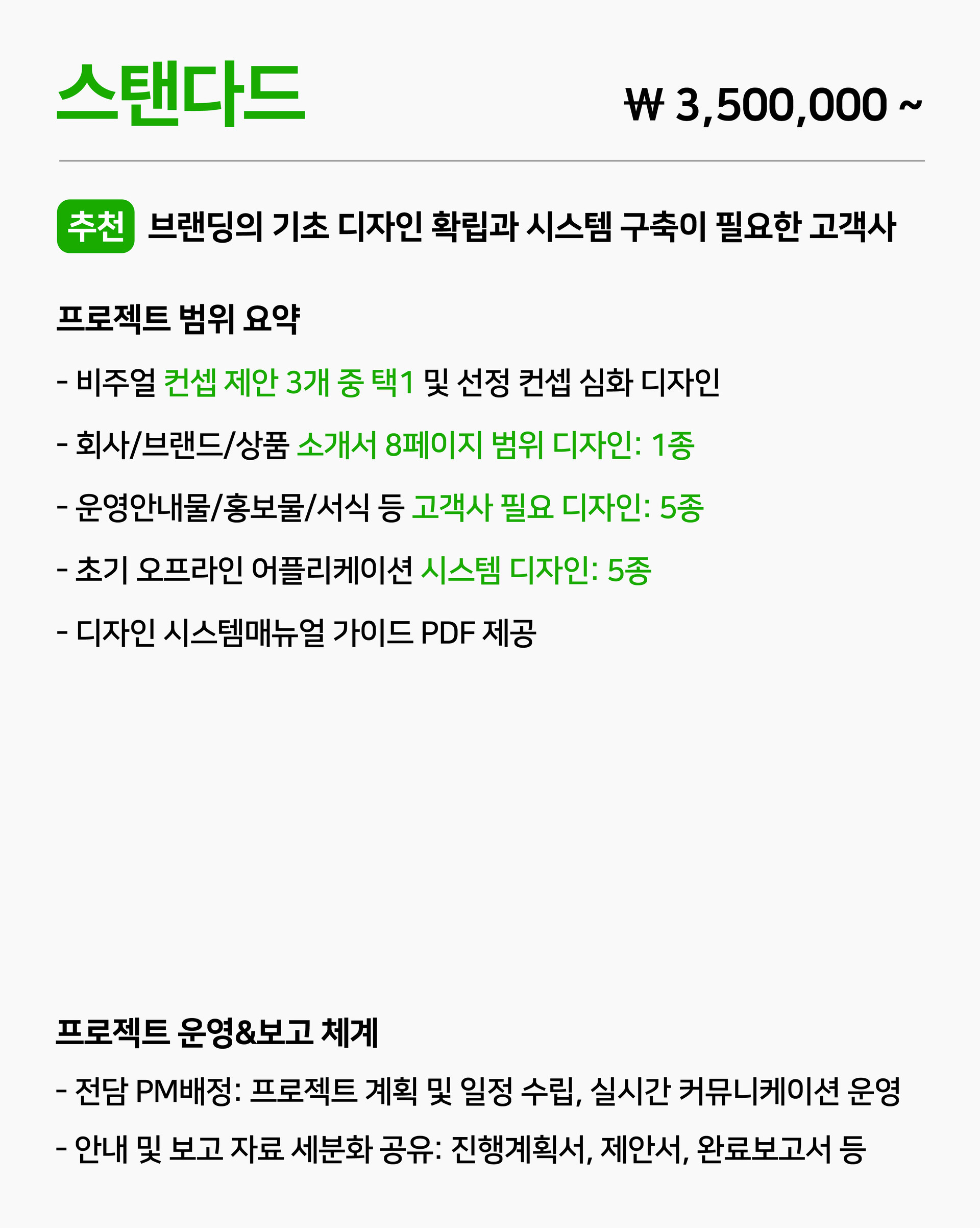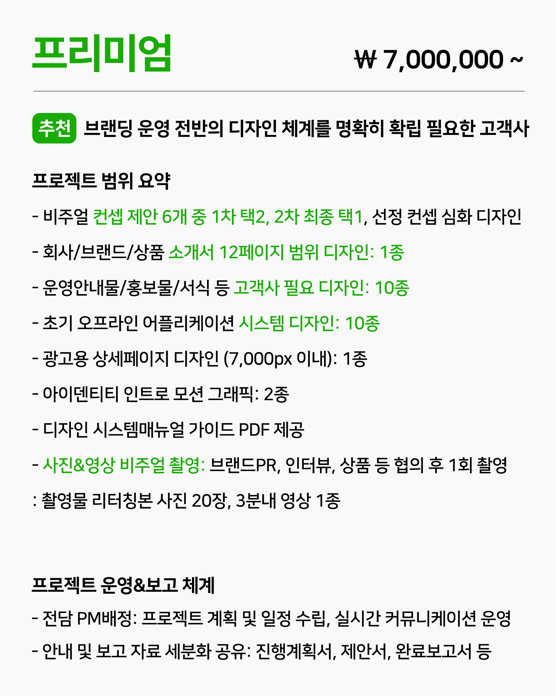 - 매뉴얼 가이드 & 산출물 인계: 사용/규정 정의 등 매뉴얼 가이드 제작, 완료 디자인물 및 최종 파일 인계