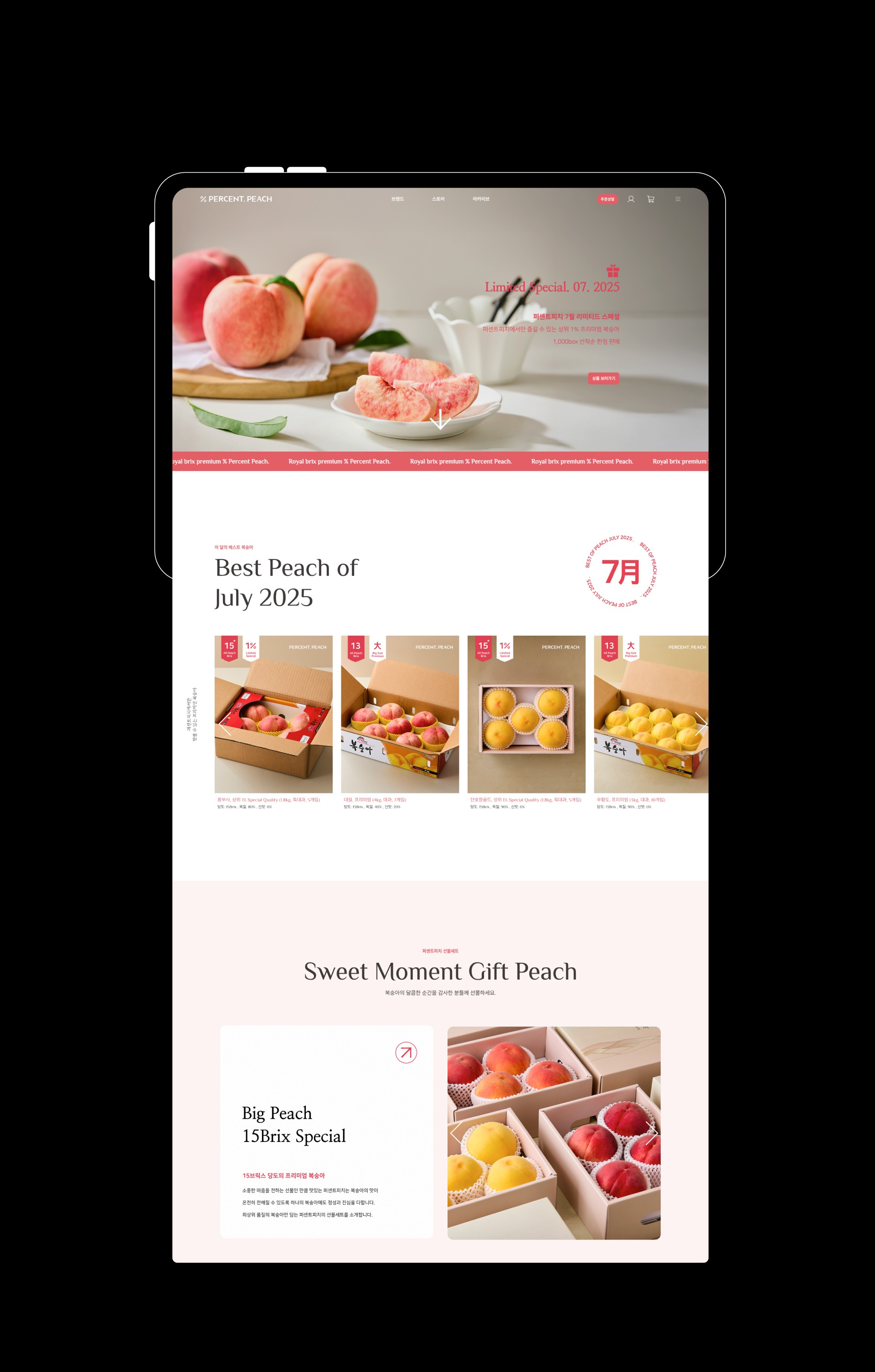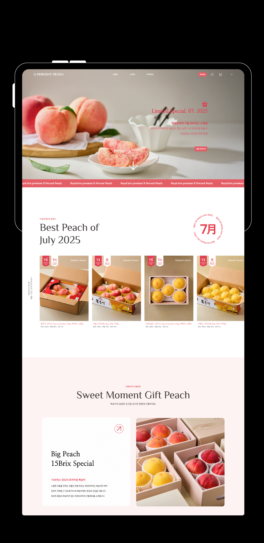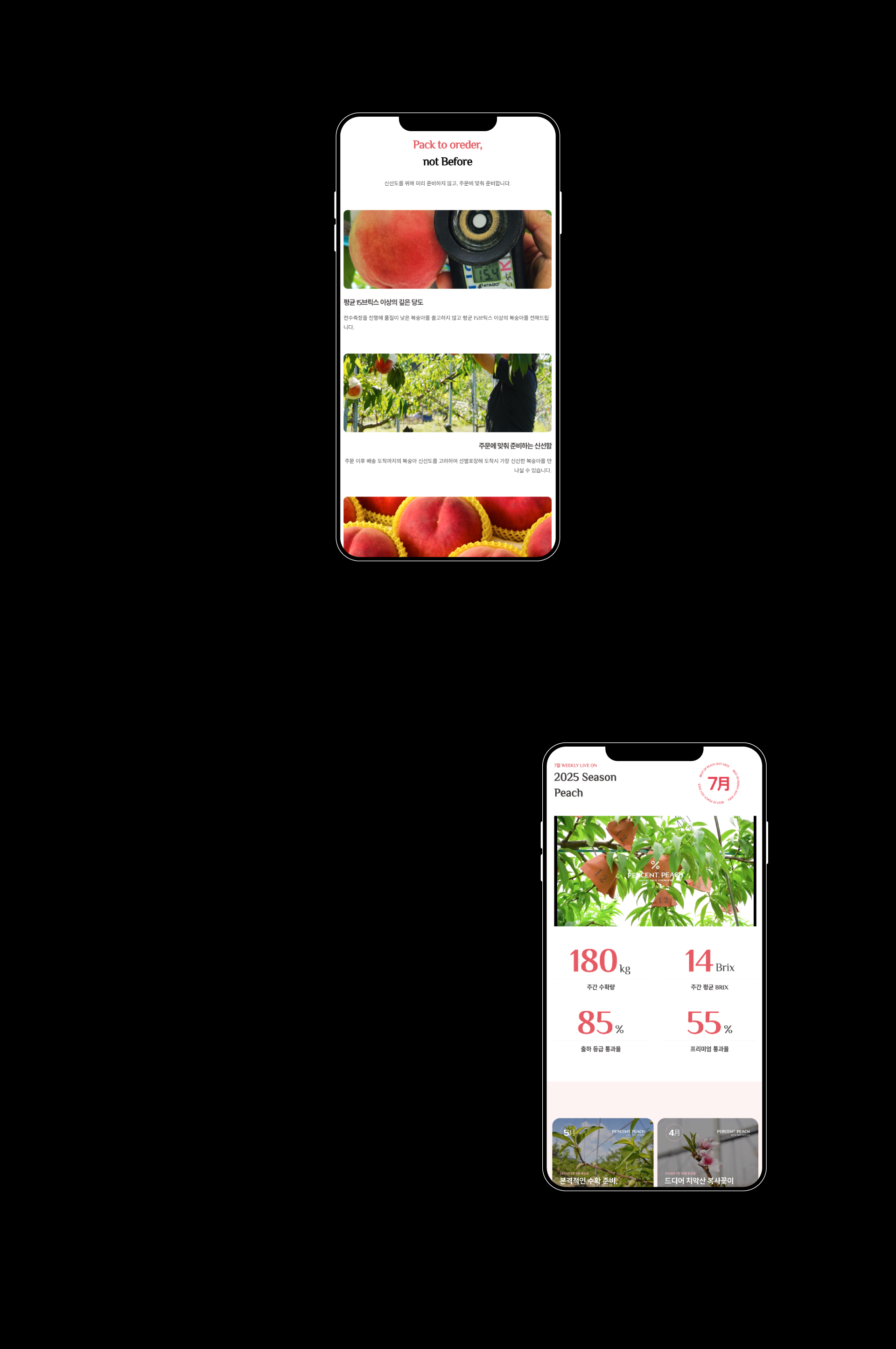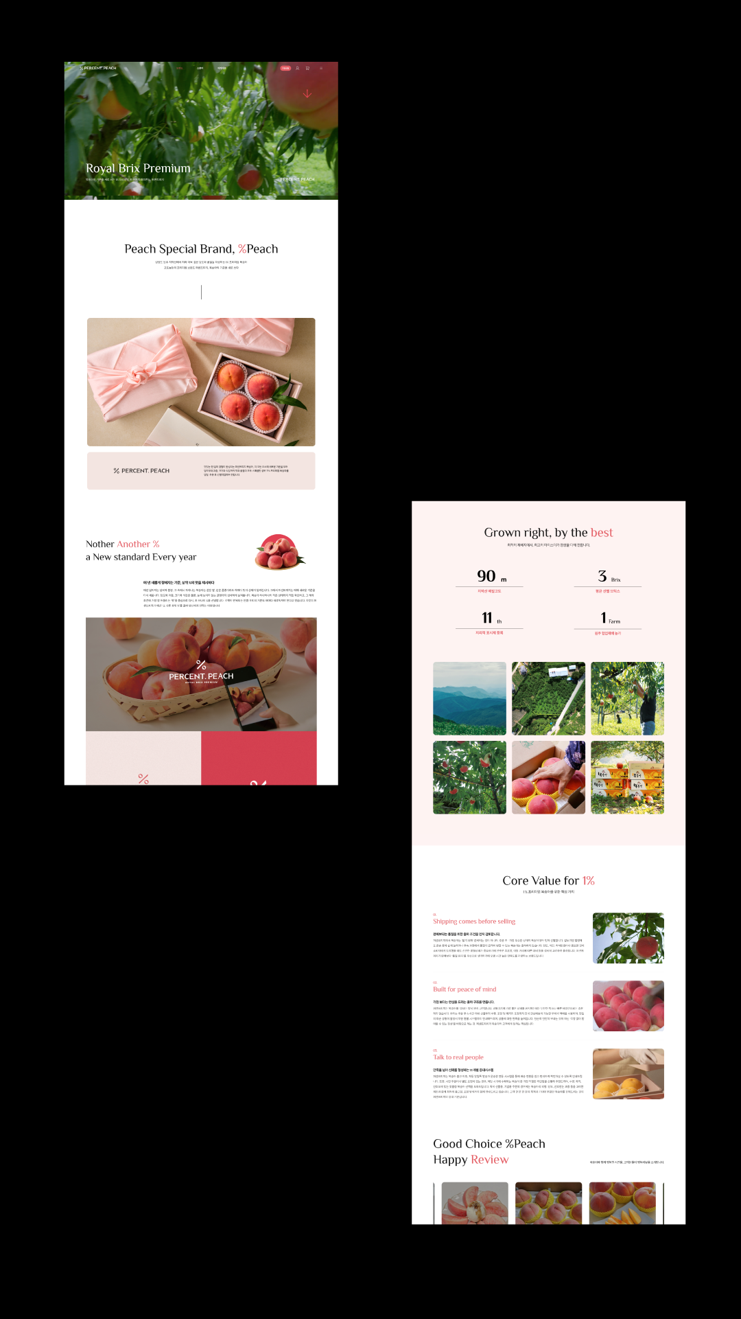 퍼센트피치는 상품의 차별성과 기준이 명확한 브랜드입니다. 당도를 중심으로 한 기준 아래 상품을 구분하고, 생산자의 진심과 소비자의 신뢰를 설득력 있게 연결하는 구조를 지향합니다. 스튜디오리드는 이러한 퍼센트피치의 구조적 특성과 내부 기준을 바탕으로, '수치 기반의 설득력'과 다양한 후기를 통한 신뢰'를 핵심에 두고 웹사이트를 기획 제작을 진행하였습니다.
